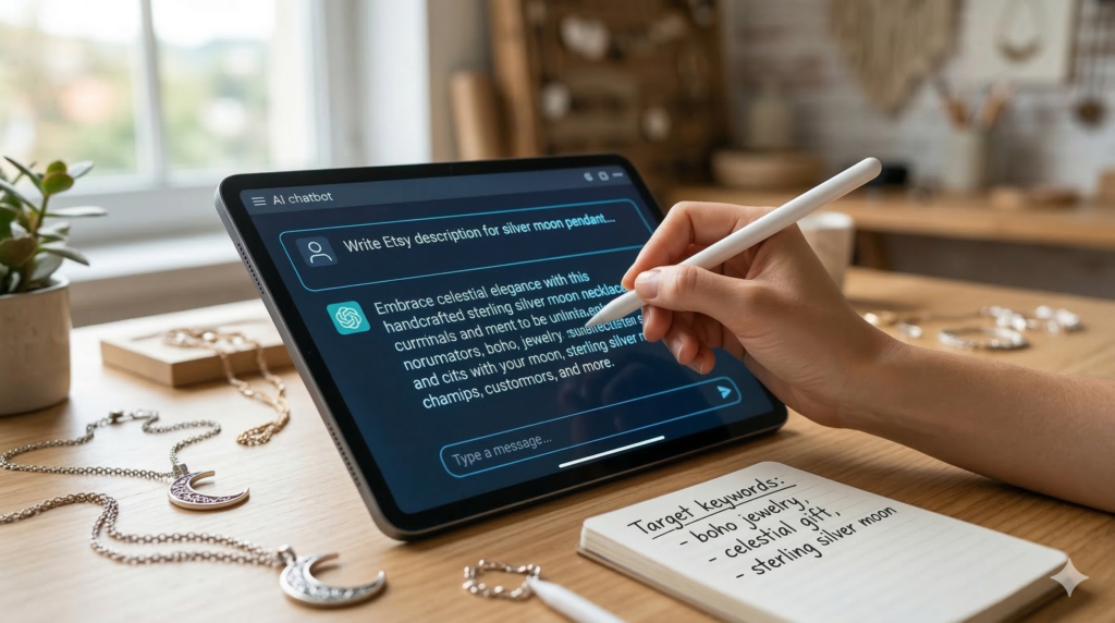 Additionally, focus on Long-Tail Keyword Stacking. Instead of just “Ring,” use “Handmade Sterling Silver Moonstone Ring for Weddings.” Long-tail keywords have less competition and attract buyers who are much closer to making a purchase decision. Use your prompts to generate at least 5 long-tail variations for every product.